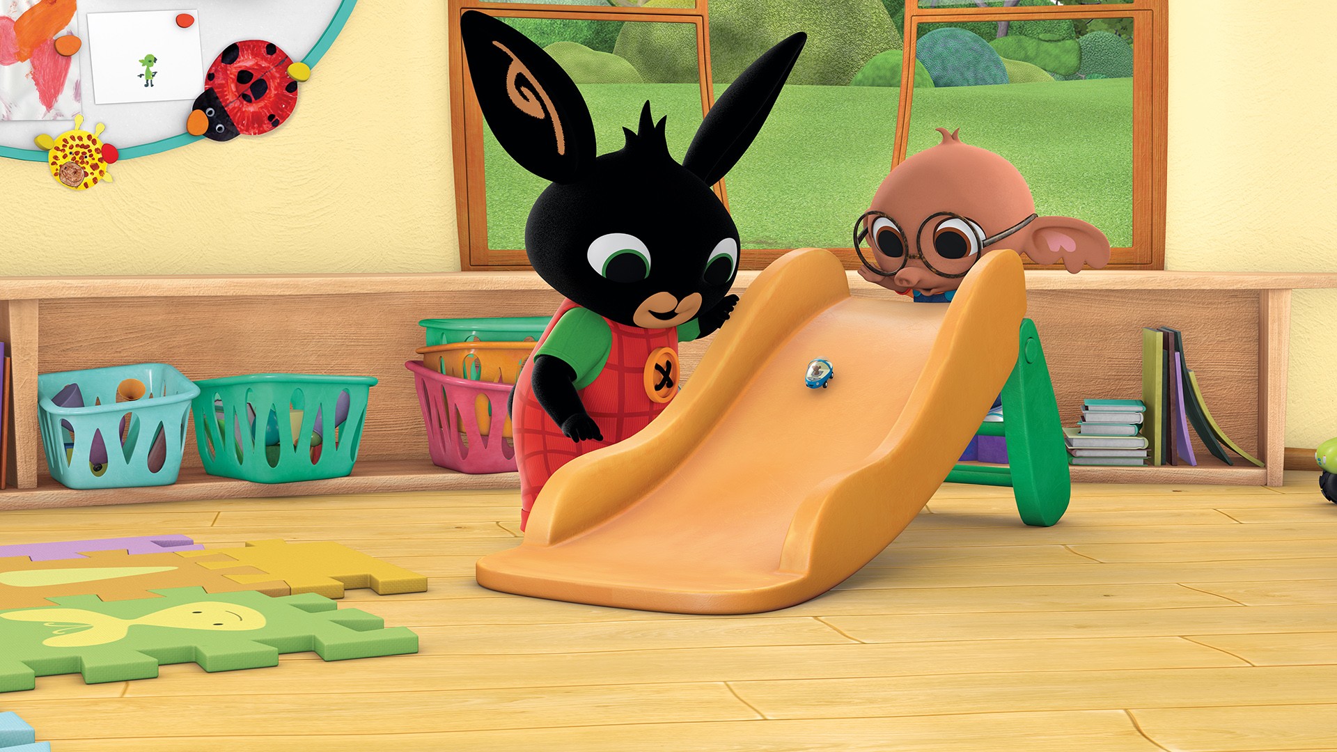 17. BallBing, Sulla og Pando leiar med ball i hagen. Bing sparkar ballen litt for langt og treff eit vindauge.7 min