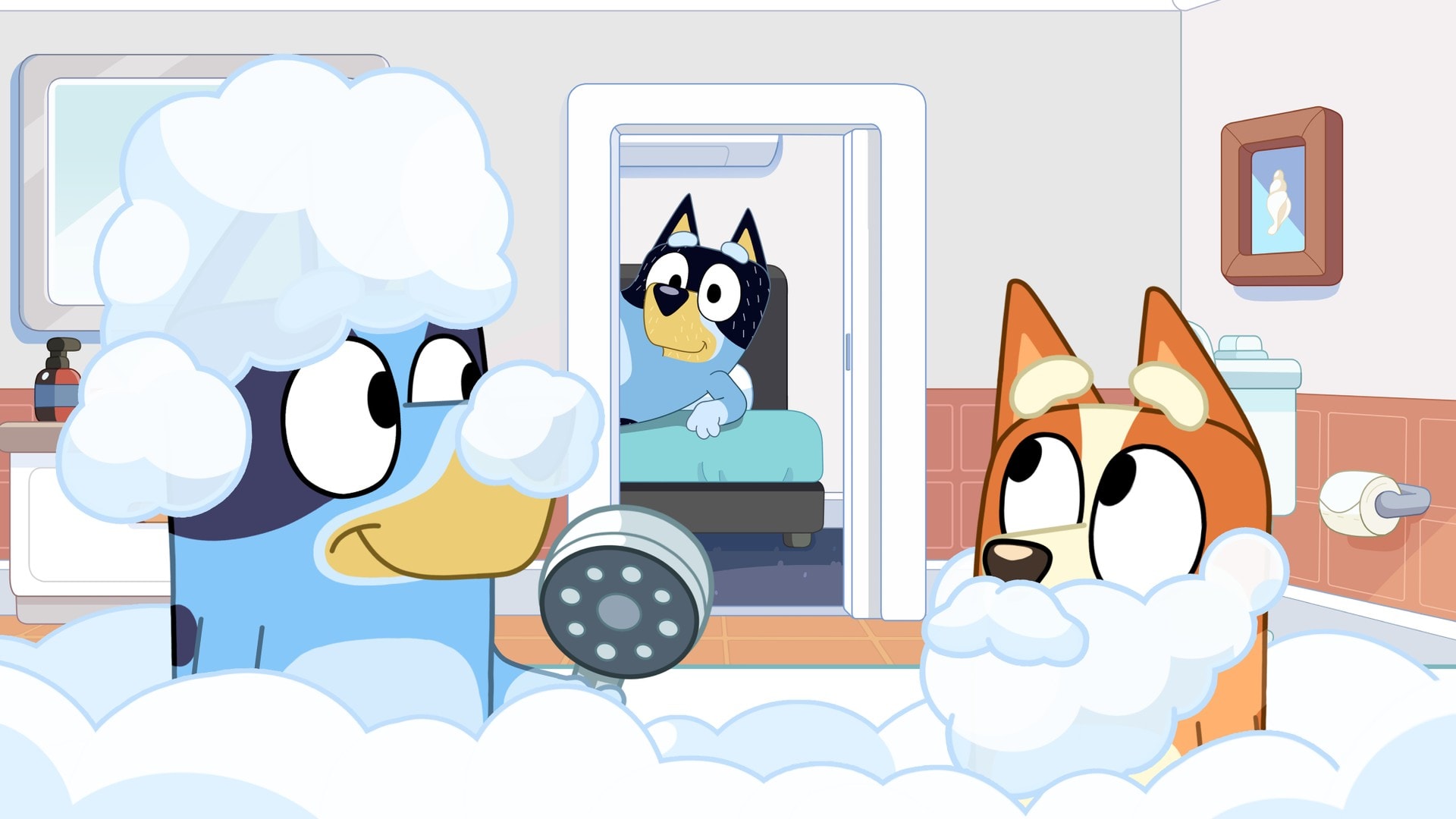 Bluey og Bingo ser seg rundt på hotellrommet når de er på ferie.