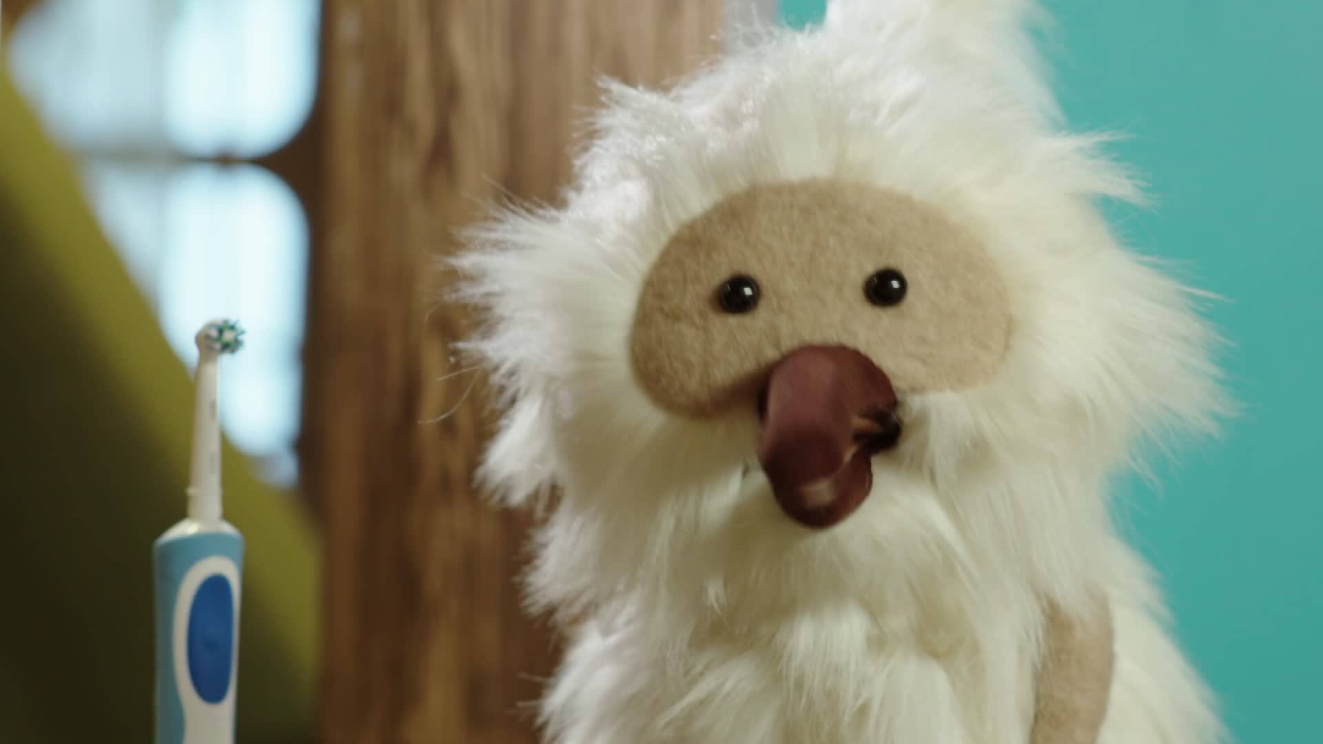 Pivi får besøk av en tannbørste.