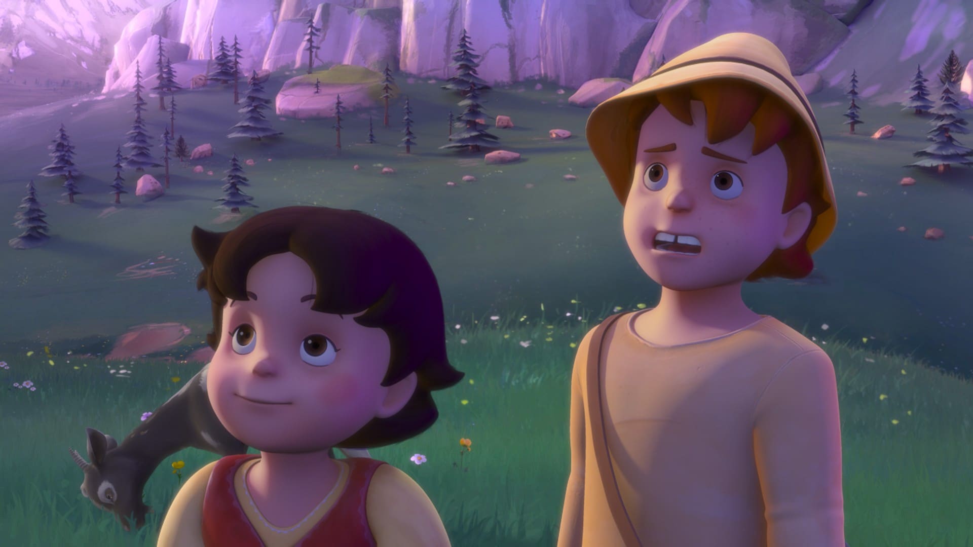 Heidi skal vere med Peter å gjete geitene opp på beitet. Peter er ikkje glad for at han må passe på Heidi i tillegg til geitene, men Heidi er veldig glad for at ho får vere med.