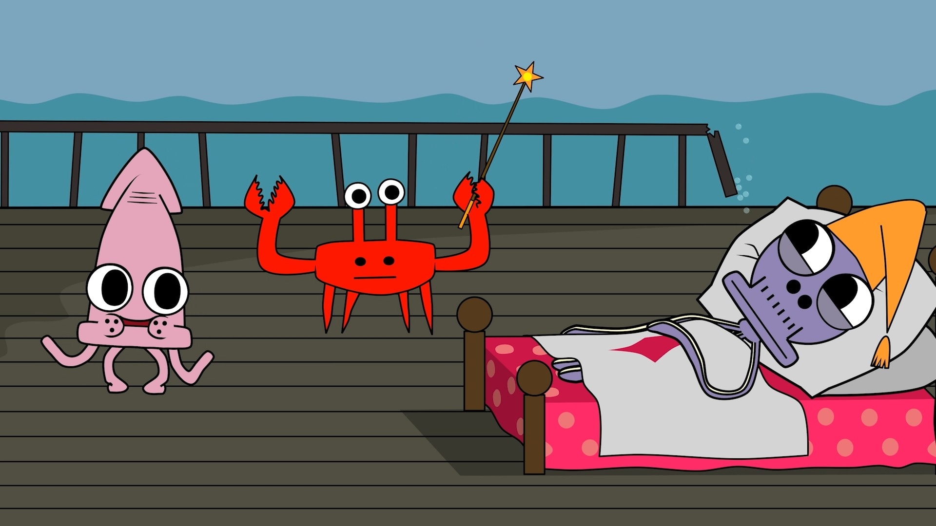 4. TryllestavI et sunket skip forstyrres en sur blekksprut av en diskofest. Han finner en magisk musikkontrollstav og blir uventet festens midtpunkt.3 min